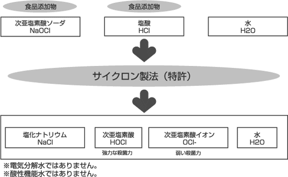 Dr.パオの主成分は厚生労働省が定めている食品添加殺菌剤である次亜塩素酸ソーダと食品添加物の塩酸を独自のサイクロン生成法(特許出願中)で希釈混合させた極めて安全性の高い生成水です。
