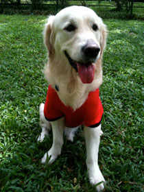 お気に入りの赤いTシャツで、今日も元気に走ります! シンガポールは雨がよく降るのでドックランで走った後はいつも泥だらけになりますが、Tシャツを着て泥からも日差しからも体を守ってます^^